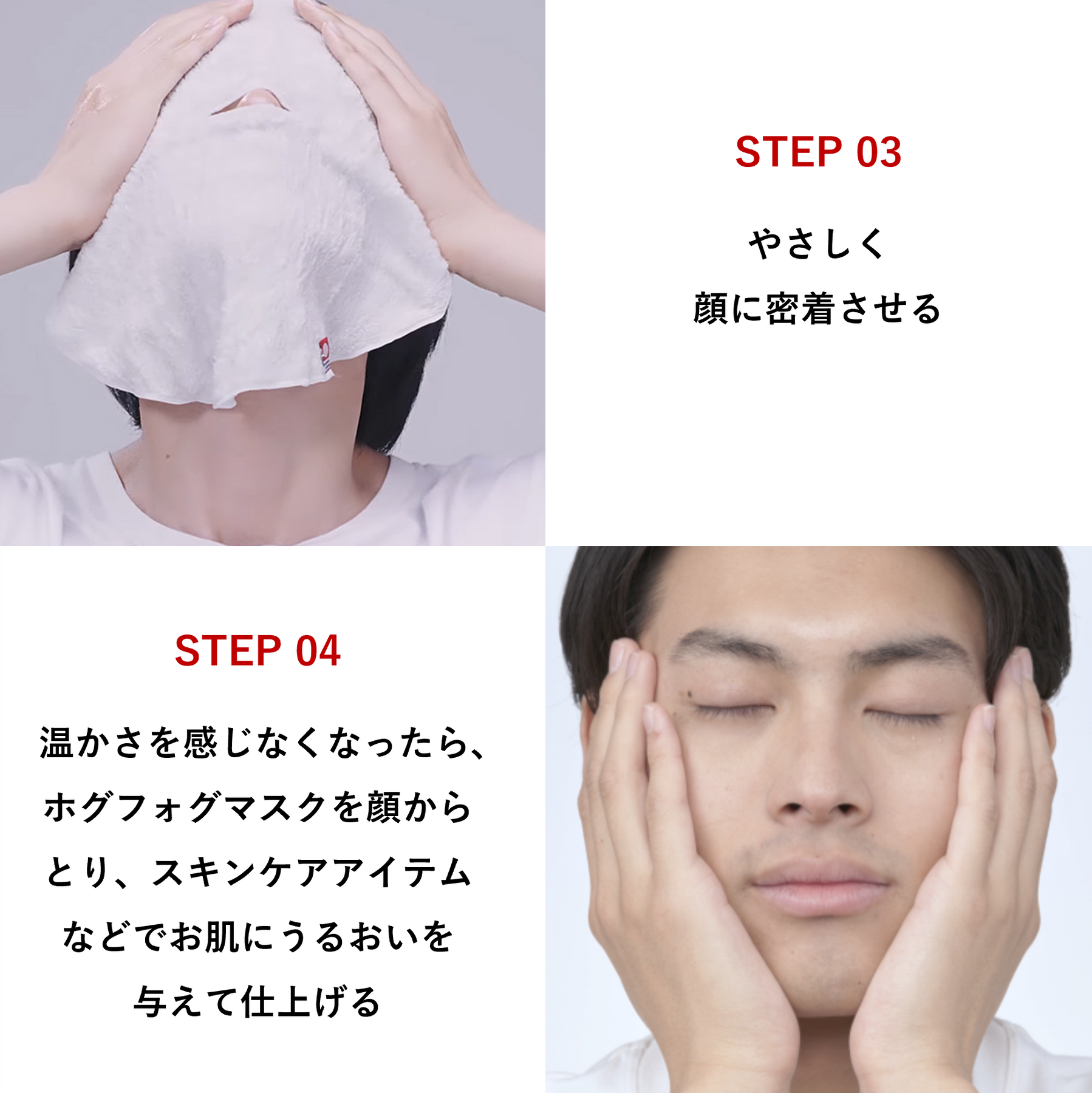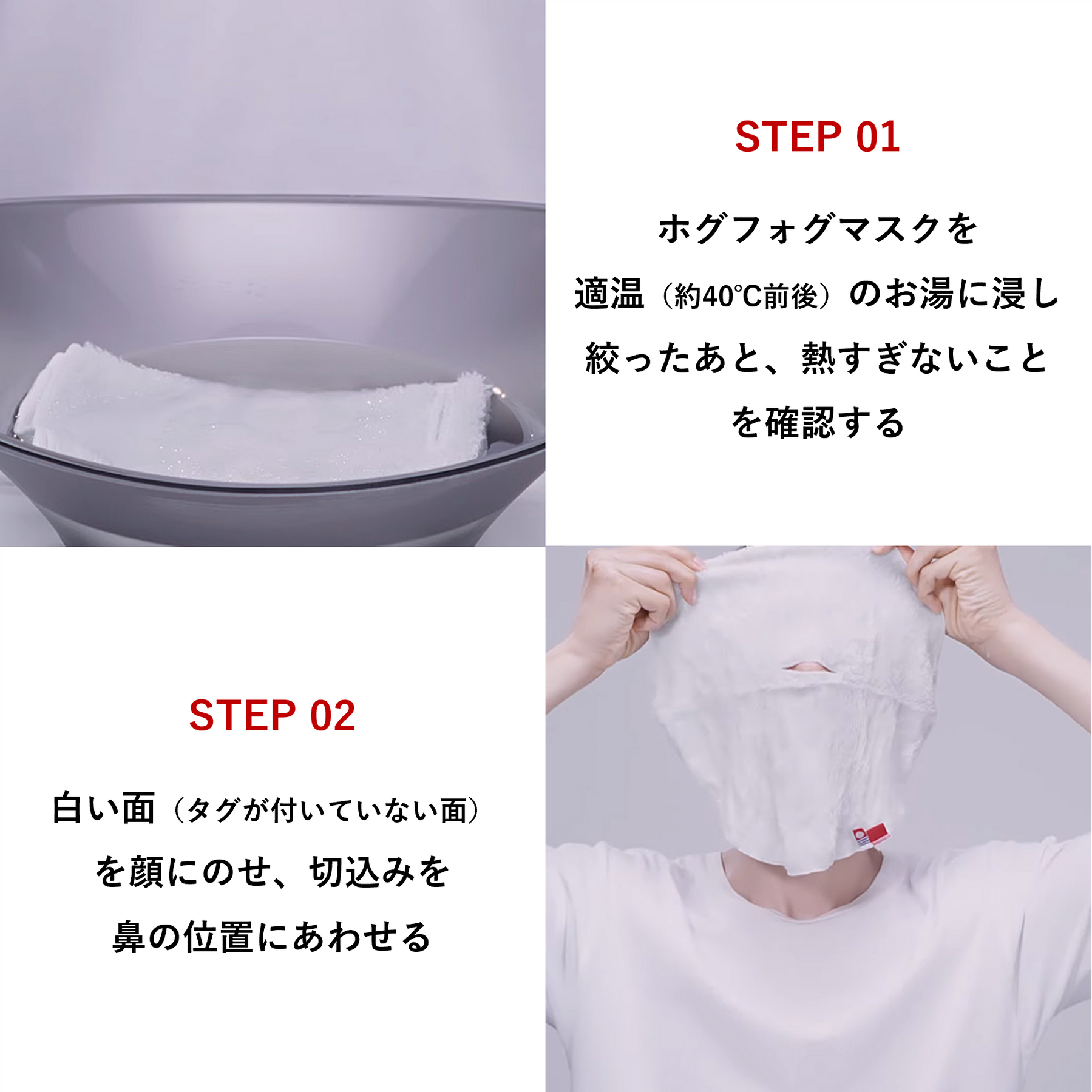 洗顔のあと、化粧水の前などにお使いください。適温(約40℃前後)のお湯にタオルマスクを浸し、絞ったあと、熱すぎないことを確認し、空気穴と鼻の位置をあわせるようにして顔にのせます。しばらく置いた後、タオルマスクの温感が冷めてきたら顔から外してください。タオルマスクは、肌触りのよい白い面が顔にあたるようにしてご使用ください。お湯以外のものは浸さないでください。